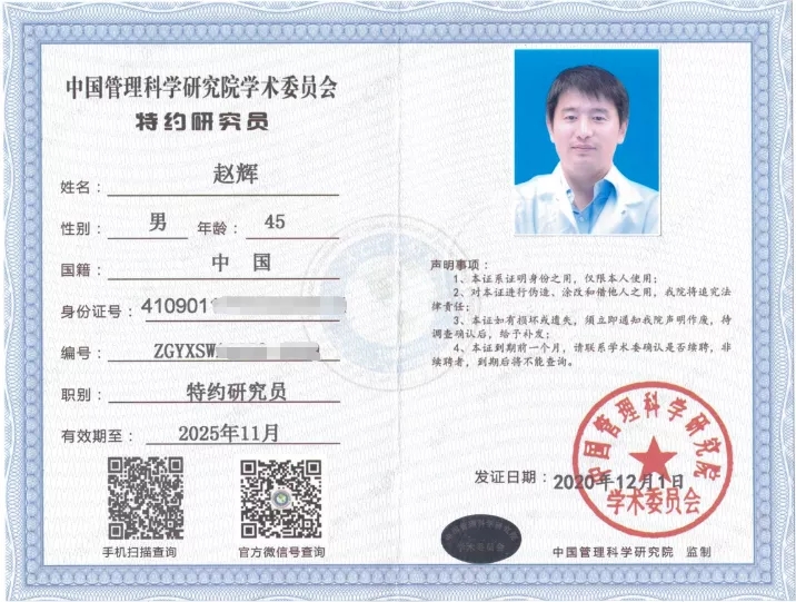 2020年12月1日,鄭州源創吉因實業有限公司董事長趙輝博士獲聘中國管理科學研究院學術委員會(簡稱"中管院學委會")“特約研究員”(證書編號:ZGYXSWA2020-####),擔任中國心腦生命教育教材編委會執行主編。
