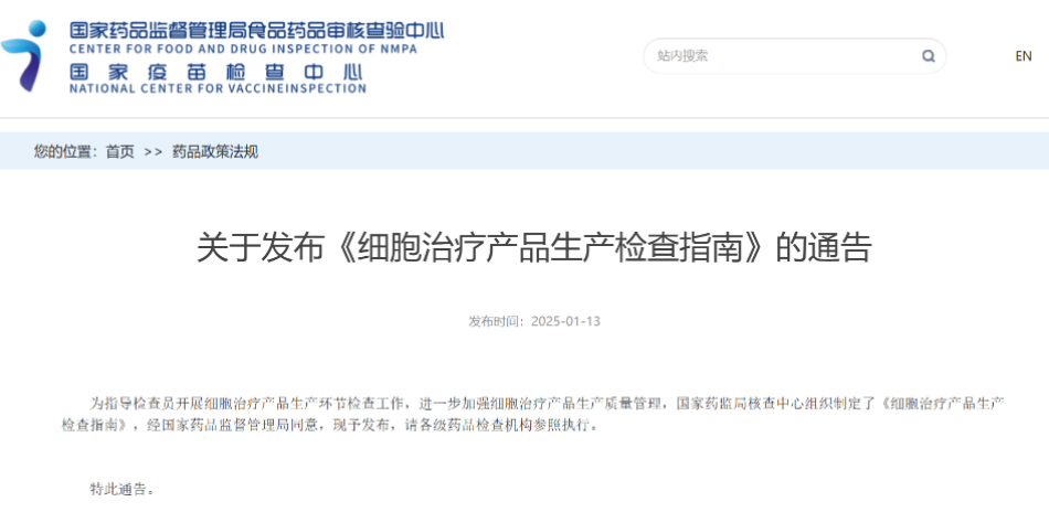 2025年1月13日,國家藥品監督管理局食品藥品審核查驗中心發布了《細胞治療產品生產檢查指南》,為細胞治療產品生產領域帶來了重要的規范與指引。