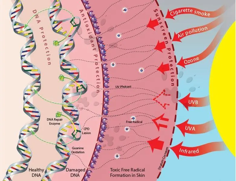 3、氧化應激:紫外線照射會產生大量自由基,危險皮膚細胞和DNA結構和功能,從而觸發機體防御系統,增加黑色素的合成。然而,長期或過量暴露于紫外線,則不僅皮膚曬黑,而且造成一系列的短期或長期改變。