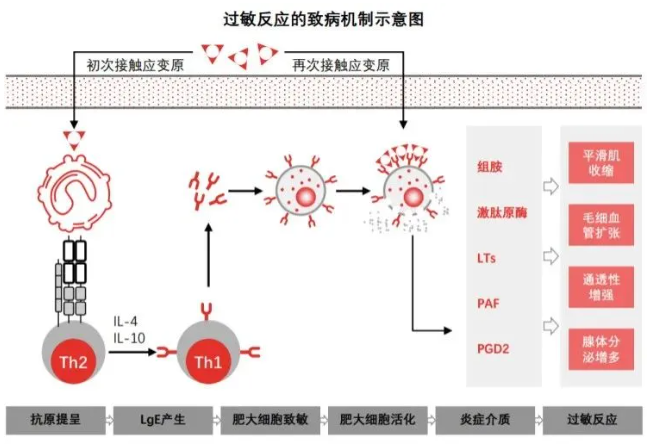 以花粉癥為例,花粉作為過敏原進入體內(nèi)后,巨噬細胞識別到異物,并通過輔助T細胞將信息傳遞給B細胞。B細胞將花粉視為入侵者,開始產(chǎn)生IgE抗體。這些抗體與鼻腔黏膜下的肥大細胞結(jié)合,當花粉成分再次進入體內(nèi)時,肥大細胞就會觸發(fā)反應,導致流鼻涕、眼睛瘙癢等癥狀。