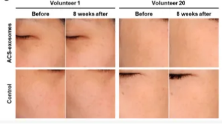 相較于只進行點陣激光的人員來說,結合使用間充質干細胞外泌體與點陣激光治療的患者面部美白效果更顯著,毛孔和皮膚疤痕縮小。這可能是因為外泌體可以提供多種抗炎和再生生長因子,加速傷口愈合修復,并且可以增加神經酰胺的合成。