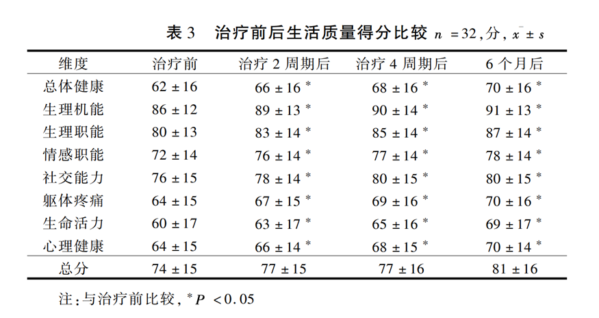 河北某醫(yī)院的一項研究對32例亞健康患者進行自體免疫細胞臨床干預4周期,對比干預前、2周期后、4周期后及6個月后患者的疲勞、睡眠及生活質量改善情況。