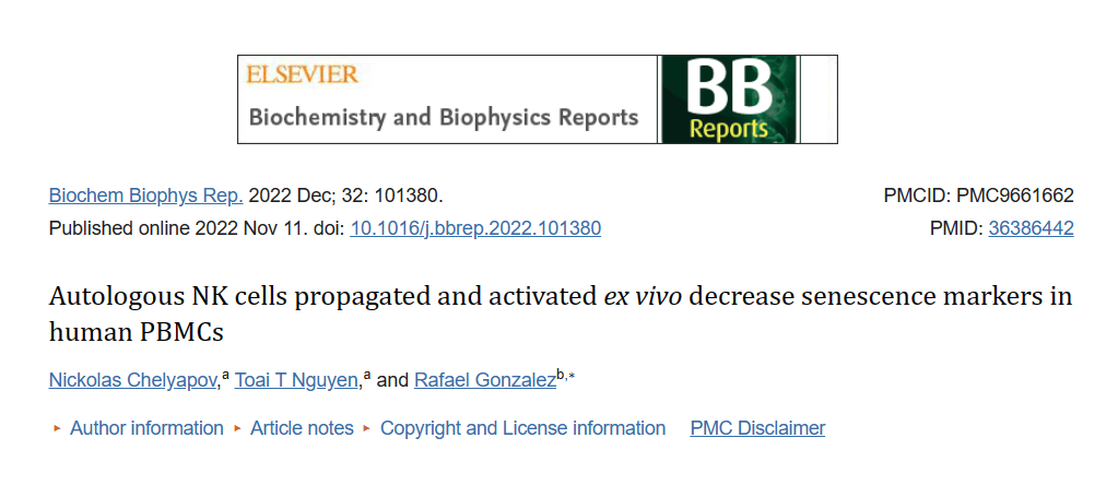 另外,國際期刊Biochemistry and Biophysics Reports中的一篇研究論文“Autologous NK cells propagated and activated ex vivo decrease senescence markers in human PBMCs”,發(fā)現(xiàn)經擴增培養(yǎng)的自體免疫細胞,除了表現(xiàn)出很強的殺傷腫瘤細胞和清除衰老細胞的能力外,還能夠降低血液中外周血單個核細胞(PBMC)的衰老標記物。