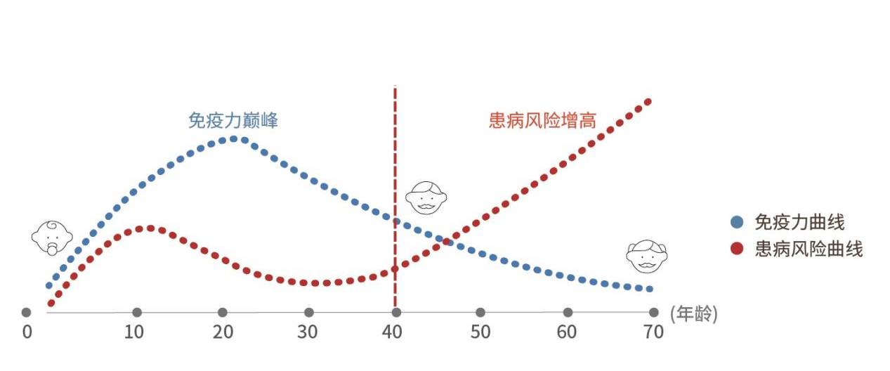 不過,當我們20歲以后,免疫細胞的質量和活性在逐漸降低;到70歲的時候,會下降到20歲時期的10%,這時人體的整個免疫機能感染和患癌癥的風險就會顯著增加。