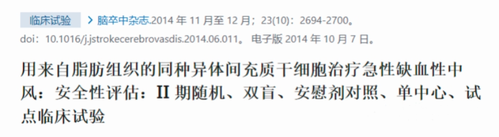 自體骨髓單核細胞治療:2014年的II期隨機、雙盲、安慰劑對照單中心試點臨床試驗顯示,急性中風后2周的患者接受靜脈注射來自脂肪組織的同種異體間充質干細胞治療,顯示出較好的療效且未發(fā)生不良事件。這表明使用同種異體MSC可能是治療中風的替代療法,因為它們缺乏II類HLA抗原。