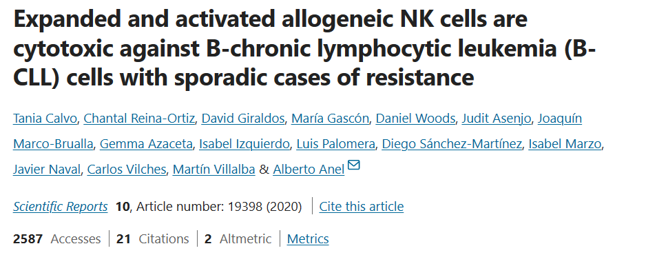 《Scientific Reports》期刊上的一項(xiàng)研究測試了通過優(yōu)化的擴(kuò)增和激活協(xié)議得到的NK細(xì)胞對35位B-CLL患者的樣本的細(xì)胞毒性,探討了NK細(xì)胞在B-CLL治療中的潛力,并研究了患者對eNK治療的抗性機(jī)制。