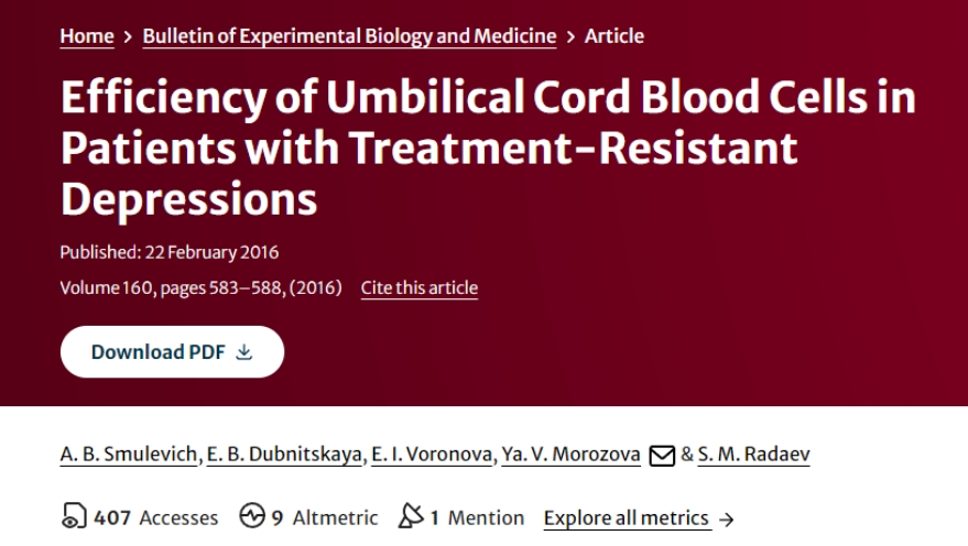 2016年2月22日,俄羅斯莫斯科醫(yī)學(xué)科學(xué)院心理健康研究中心在期刊雜志《Bulletin of Experimental Biology and Medicine》上發(fā)表了一篇關(guān)于《臍帶血細(xì)胞對(duì)難治性抑郁癥患者的治療效果》的研究成果。