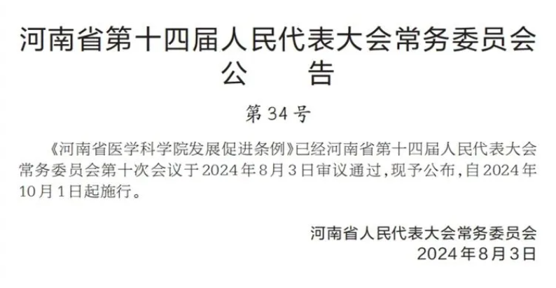 河南省第十四屆人民代表大會常務(wù)委員會第十次會議圓滿結(jié)束,會議審議并通過了《河南省醫(yī)學(xué)科學(xué)院發(fā)展促進條例》(以下簡稱“條例”),該條例于2024年10月1日起施行。