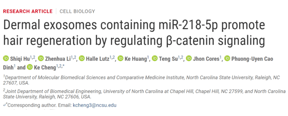 近期,美國一科研團隊在Science Advances上發表了題為:Dermal exosomes containing miR-218-5p promote hair regeneration by regulating β-catenin signaling的研究論文。