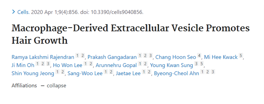 2020年韓國國立慶北大學醫學院核醫學系的科學家們在Cells上發表文章指出,巨噬細胞衍生的細胞外囊泡能促進頭發生長。