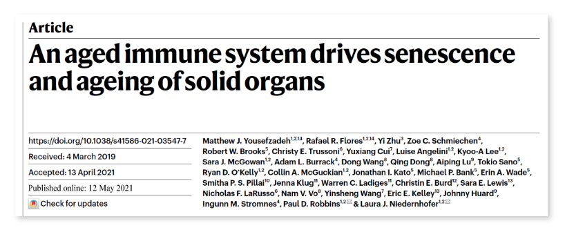 細胞衰老是機體衰老的關鍵驅動因素。2021年5月12日,美國明尼蘇達大學醫學院的研究人員在《Nature》發表了題為《An aged immune system drives senescence and ageing of solid organs》的研究論文。