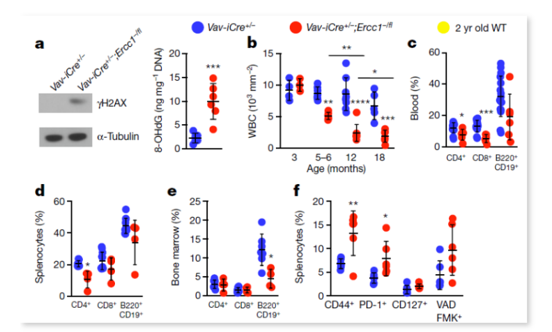 研究中,為了明確免疫系統老化對機體老化的影響,研究團隊在小鼠造血細胞中選擇性刪除了Ercc1基因,從而僅在免疫系統中增加內源性DNA損傷負擔增加而導致的免疫細胞衰老。