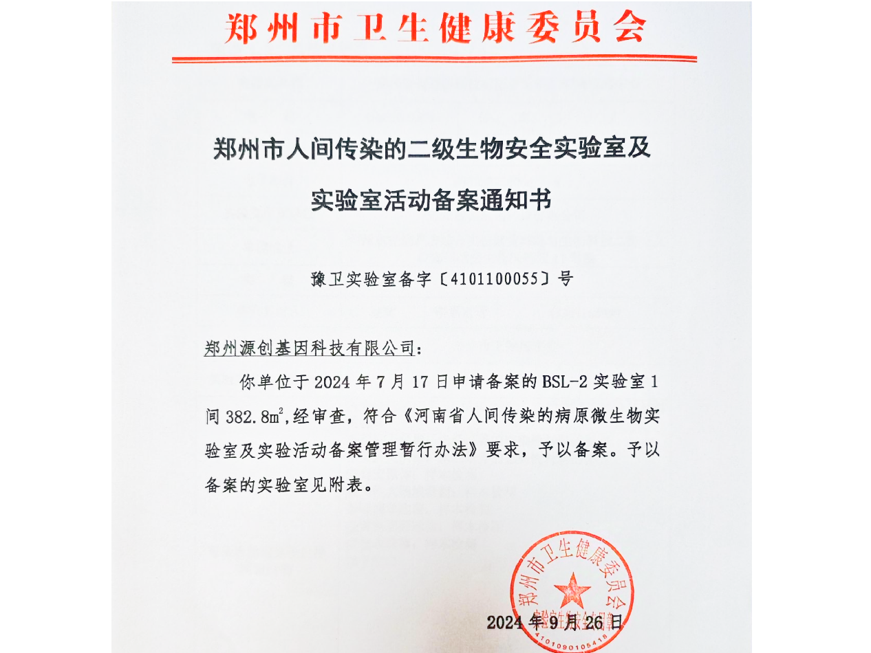 近日,鄭州源創基因科技有限公司按照《中華人民共和國生物安全法》、《病原微生物實驗室生物安全管理條例》以及《河南省人間傳染的病原微生物實驗室及實驗活動備案管理暫行辦法》等國家及地方相關法律法規的要求,順利通過二級生物安全實驗室(BSL-2)備案。