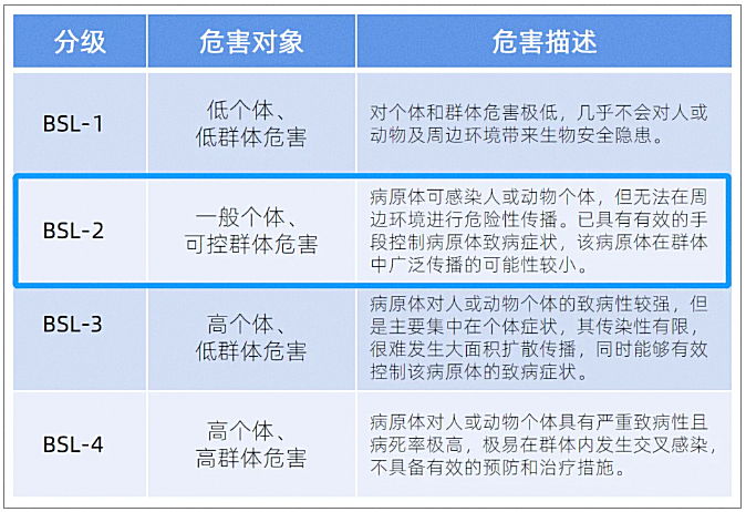 生物安全實驗室(Bio-safety Laboratory)是指通過防護屏障和管理措施,達到生物安全要求的病原微生物實驗室。國家根據實驗室對病原微生物的生物安全防護水平,并依照實驗室生物安全國家標準的規定,將實驗室分為不同的生物安全等級,其中BSL-2實驗室適用于操作中等危害的微生物,需要采取一定的生物安全措施。