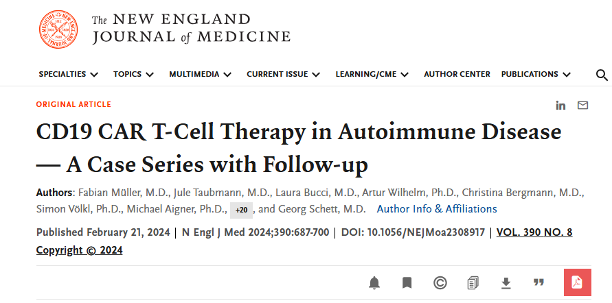 2024年2月22日,德國埃爾朗根-紐倫堡大學的Georg Schett教授團隊在《新英格蘭醫學雜志》(NEJM)上發表了題為:CD19 CAR T-Cell Therapy in Autoimmune Disease—A Case Series with Follow-up的研究論文。