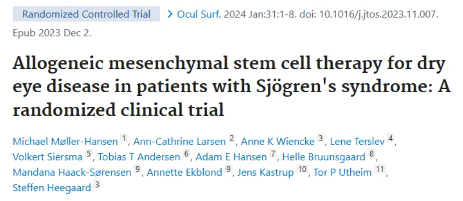 2024年1月在《National Library of Medicine》上發(fā)表了一項(xiàng)關(guān)于同種異體間充質(zhì)干細(xì)胞療法緩解干燥綜合征患者干眼癥的研究。這是一項(xiàng)雙盲隨機(jī)臨床試驗(yàn),評(píng)估脂肪間充質(zhì)干細(xì)胞注射到淚腺治療繼發(fā)于SS的干眼癥的療效。