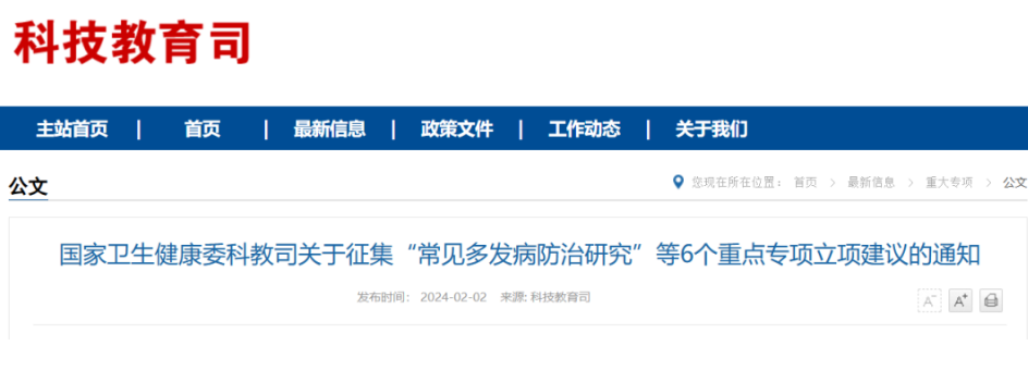 l 2024.02.02 國家衛生健康委科教司征集“常見多發病防治研究”等6個重點專項立項建議