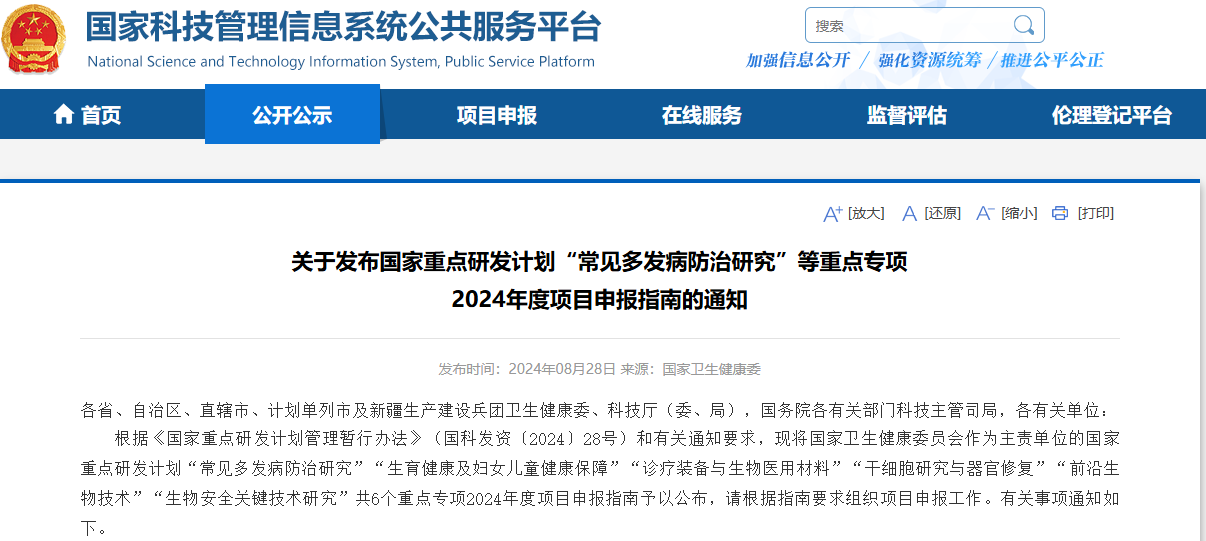 l 2024.08.28 國家重點研發計劃“常見多發病防治研究”等重點專項2024年度項目申報指南