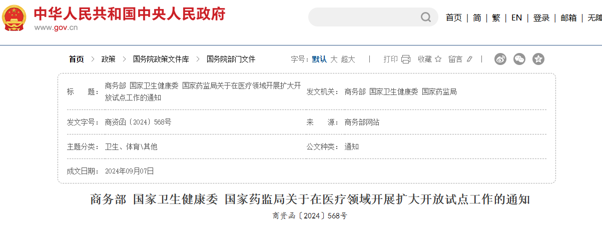l 2024.09.07 商務部 國家衛生健康委 國家藥監局關于在醫療領域開展擴大開放試點工作