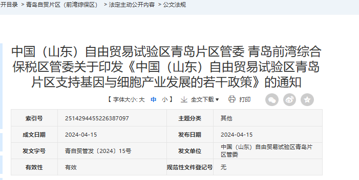 l 《中國(山東)自由貿(mào)易試驗(yàn)區(qū)青島片區(qū)支持基因與細(xì)胞產(chǎn)業(yè)發(fā)展的若干政策》