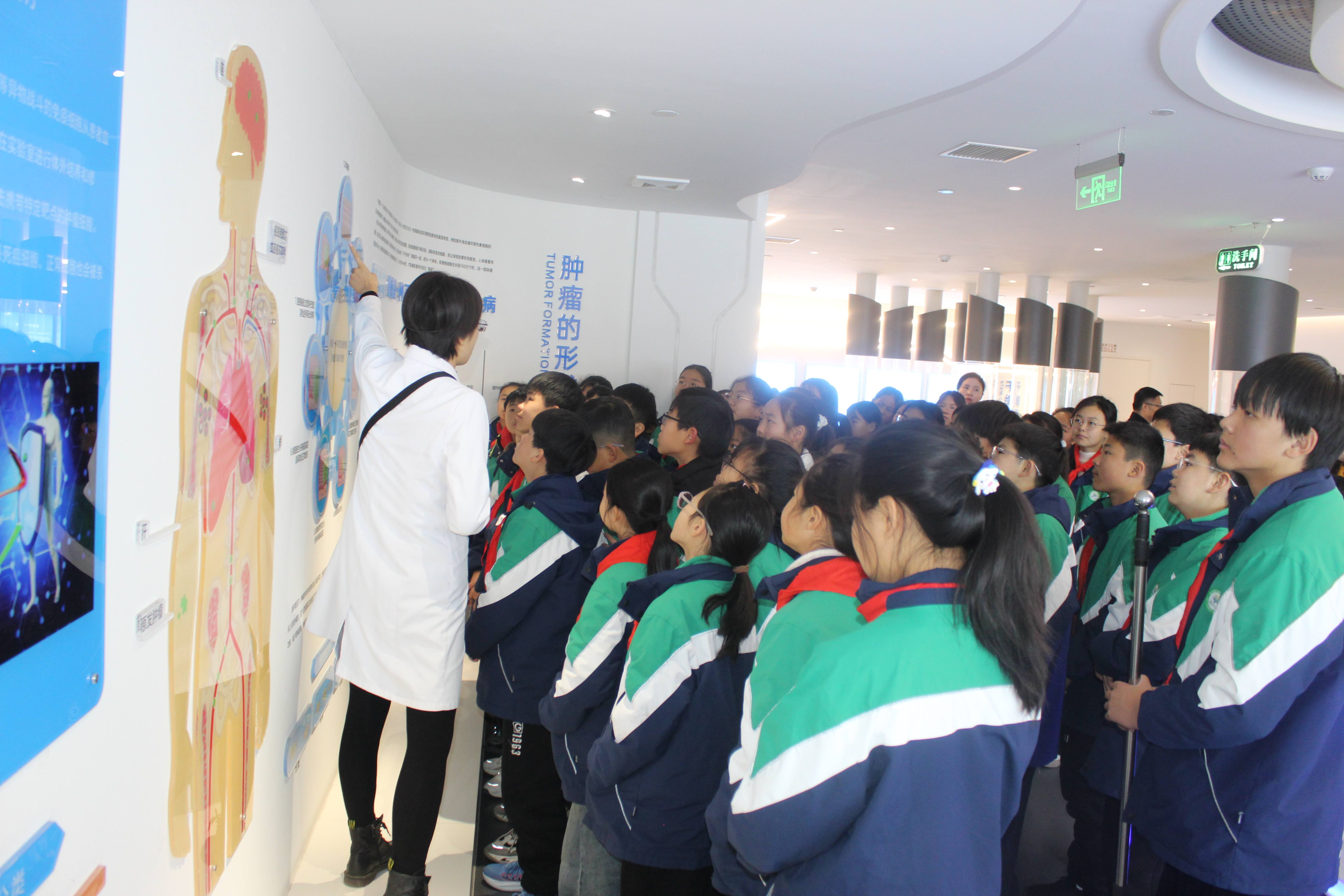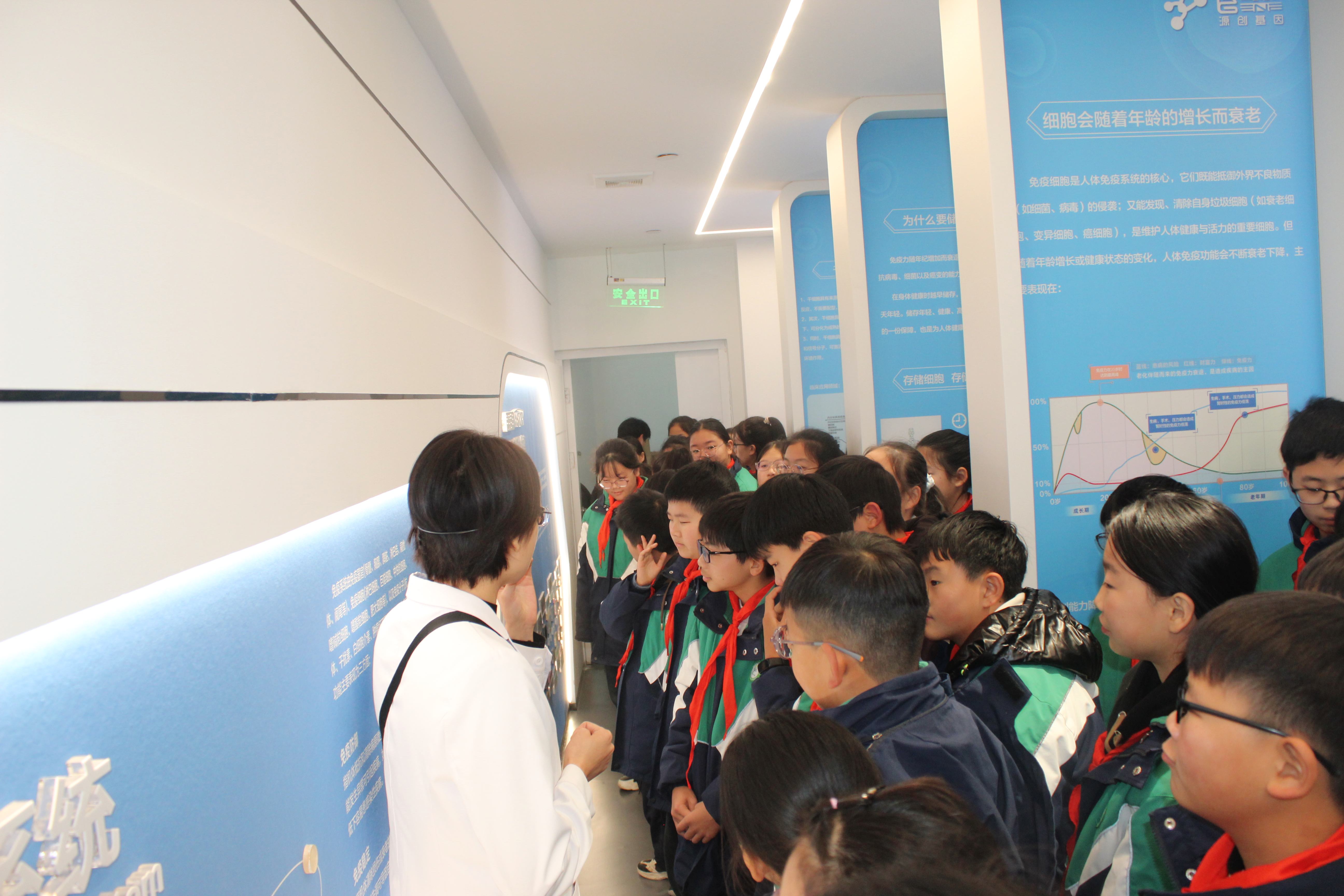 活動伊始,學校師生在源創基因培培老師的帶領下,參觀了源創生命科學館。培培老師通過生動的語言,為學生們揭開了干細胞及免疫細胞的神秘面紗,深入淺出地介紹了其定義、分類及在疾病治療、組織修復等方面的廣泛應用。特別是“免疫力”這一模塊,生動的案例講述讓學生們感受到了免疫細胞的巨大作用,并認識到了積極鍛煉保持身體健康,提高免疫力的重要性,從而激發了他們對生命科學的探索熱情。