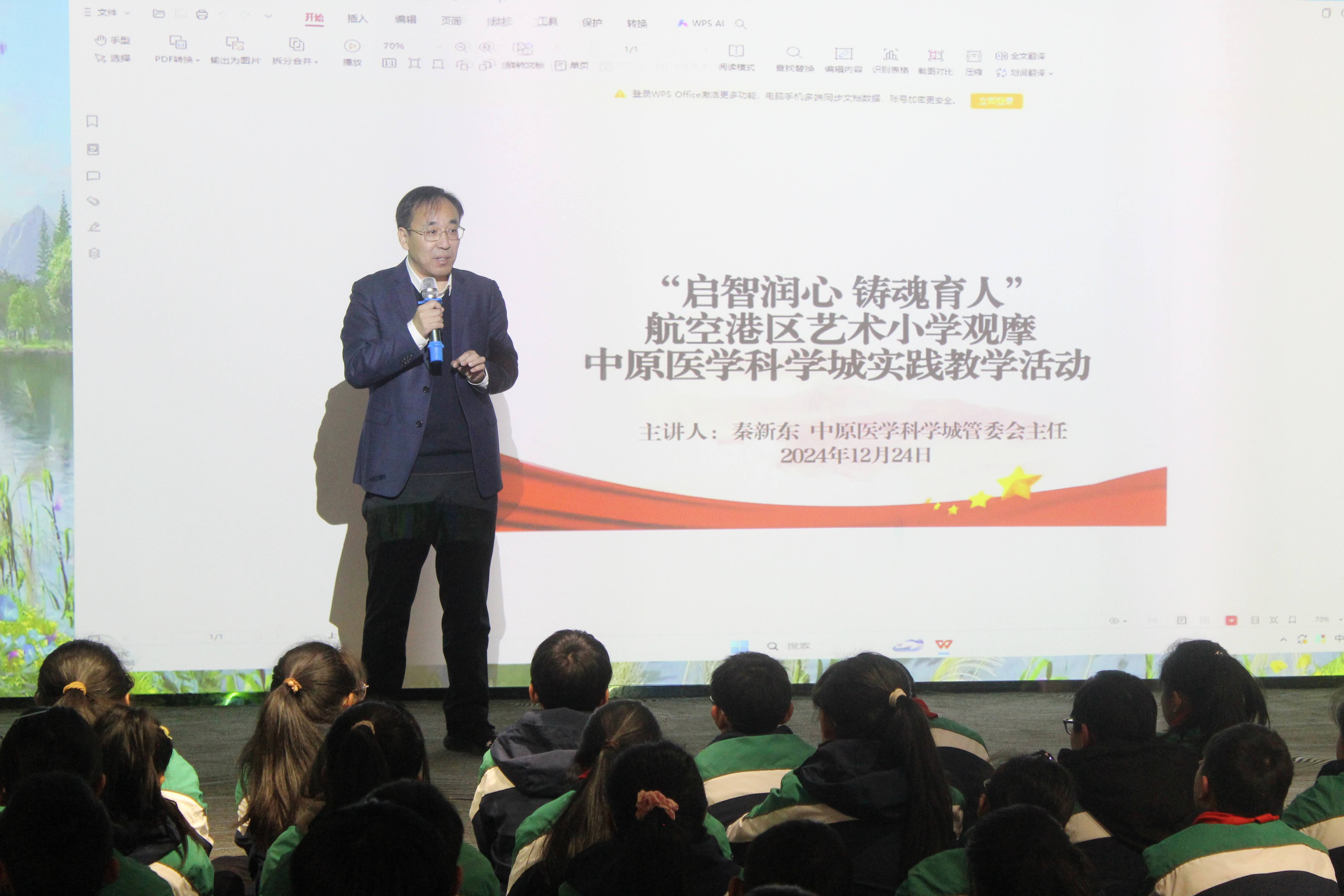 隨后,在多功能廳,源創基因王三虎教授以輕松簡單的語言,為學生們進行了公司介紹及科普知識宣講。學生們積極參與互動,現場氣氛熱烈。接著,中原醫學科學城管委會秦新東主任為學生們現場授課,講述了細胞如何組成人體以及細胞的重要性。在平等溝通、互動交流中,秦主任啟迪了學生的道德情操,引導他們形成了愛黨、愛國、愛科學、愛集體、建設美好家鄉的情感。