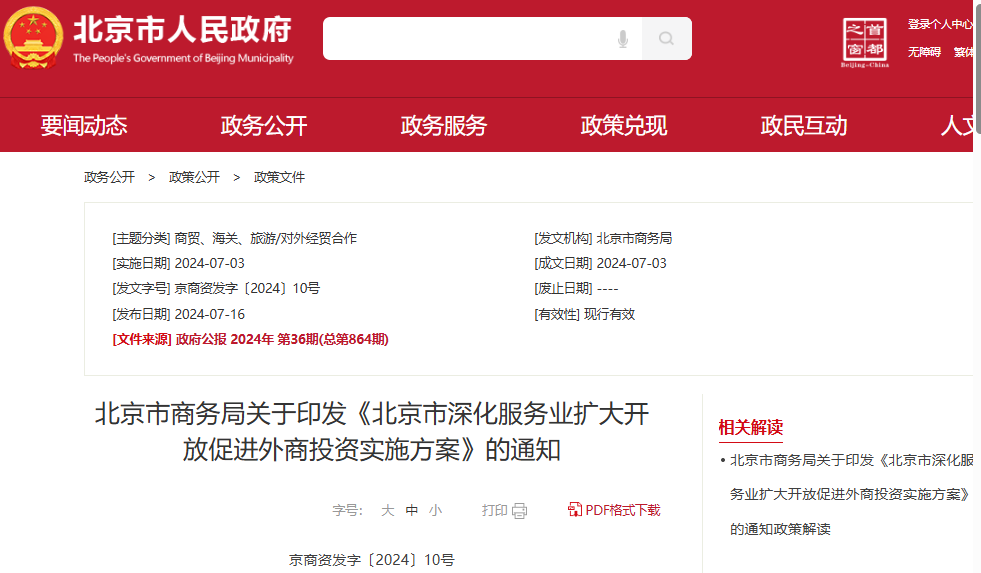 l 《北京市深化服務業擴大開放促進外商投資實施方案》