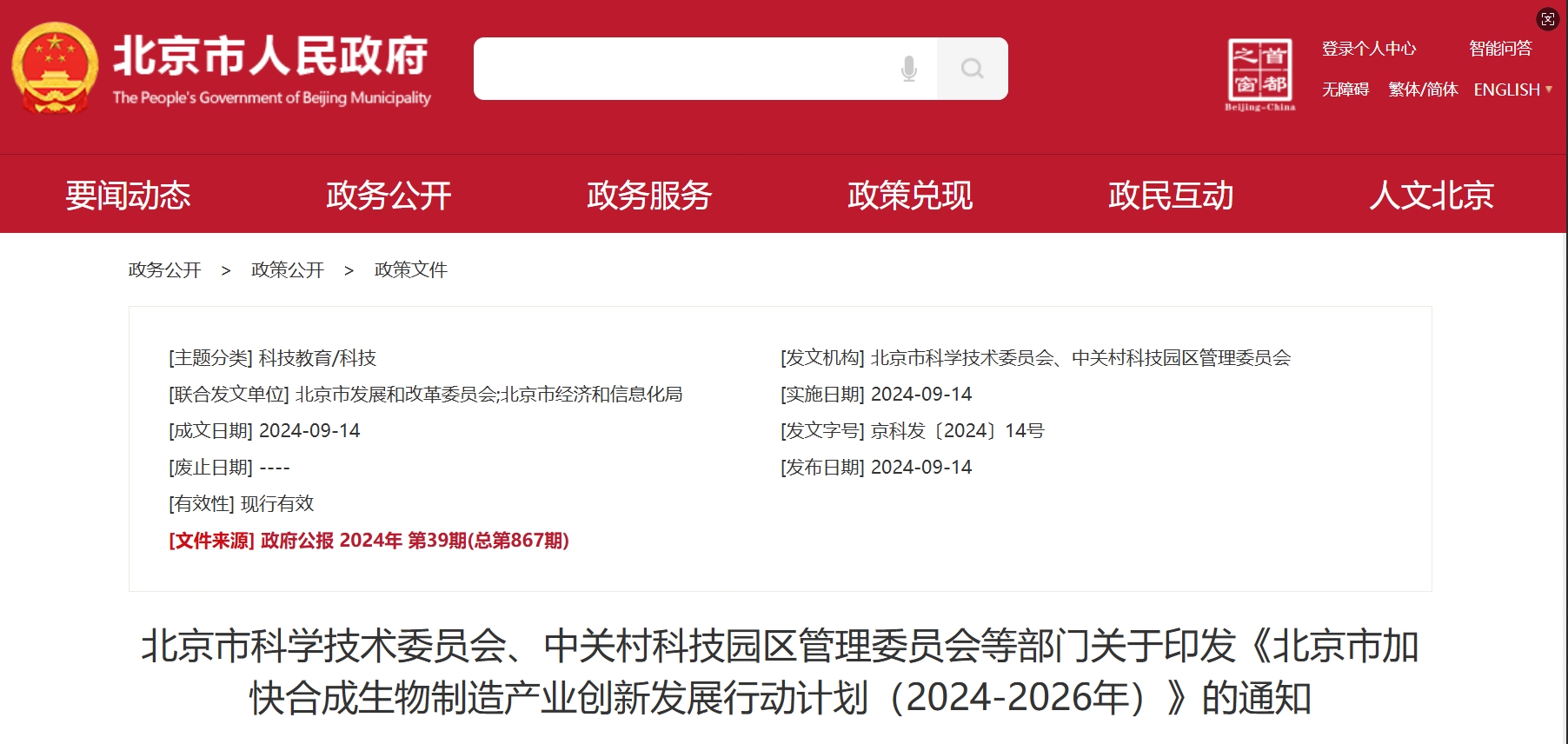 l 《北京市加快合成生物制造產業創新發展行動計劃(2024-2026年)》