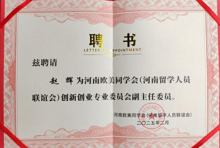 值得一提的是,河南歐美同學會創新創業專業委員會在會上正式揭牌成立。趙輝博士憑借其豐富的創新創業經驗和卓越的學術成就,被聘請為該委員會副主任委員。