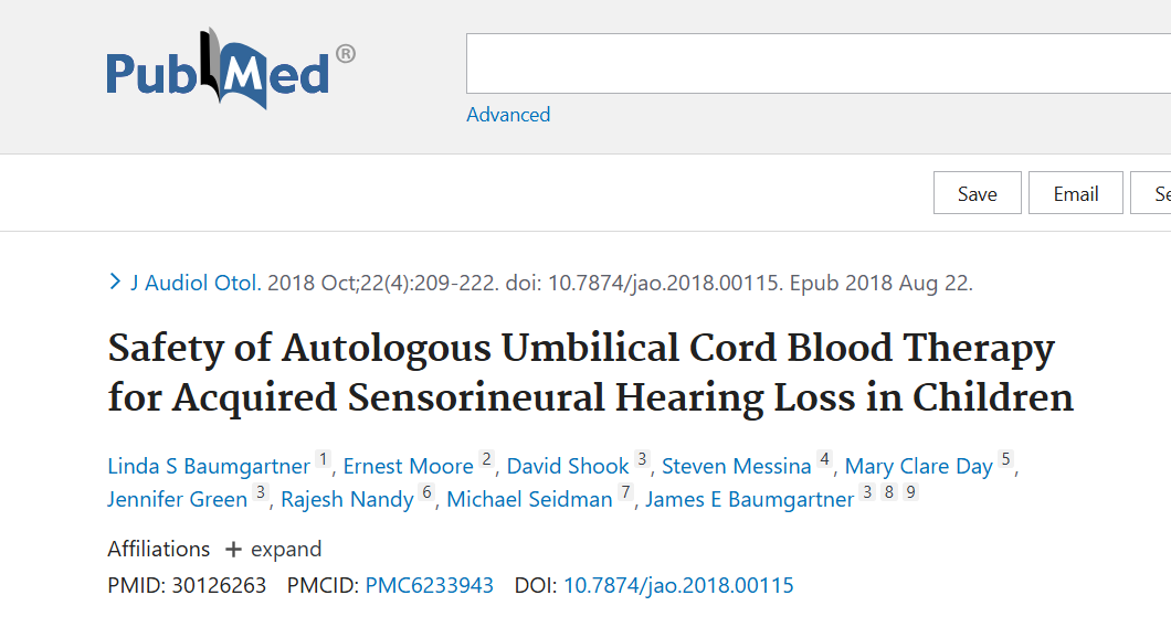 2018年,美國Cord Blood Registry臍帶血庫公布了采用自體臍帶血治療兒童獲得性感音神經性耳聾(SNHL)的臨床研究積極結果。該研究在11例6個月至6歲獲得性SNHL兒童患者中開展,評估了靜脈輸注自體臍帶血的安全性和初步療效。研究結果顯示,輸注自體臍帶血安全、可行且耐受性良好,45%的患者在輸注后聽覺腦干反應表現出顯著改善(p<0.05)。