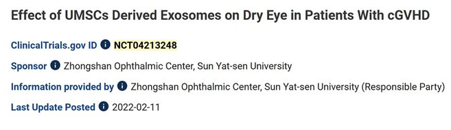 一項1/2期臨床試驗,評估臍帶間充質干細胞(UMSC)來源的外泌體對慢性移植物抗宿主病(cGvHD)相關干眼癥患者的療效。患者在使用人工淚液治療2周后,接受10g/滴的UMSC外泌體治療,每天4次,持續14天。