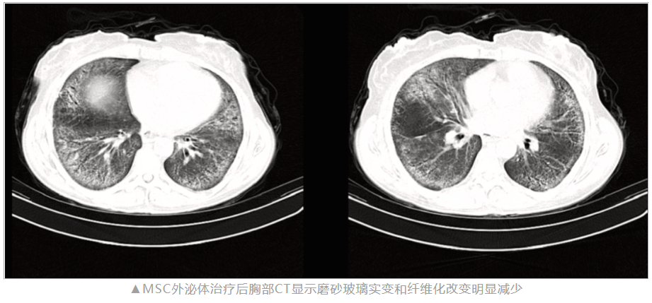 過程:患者接受了共計(jì)八次的 MSC-EVs 靜脈輸注。應(yīng)用四周后,患者反饋?zhàn)陨砗粑щy、咳嗽等癥狀得到顯著緩解。通過胸部CT掃描結(jié)果可見,肺部的玻璃樣密度以及纖維化病變均有明顯減輕。