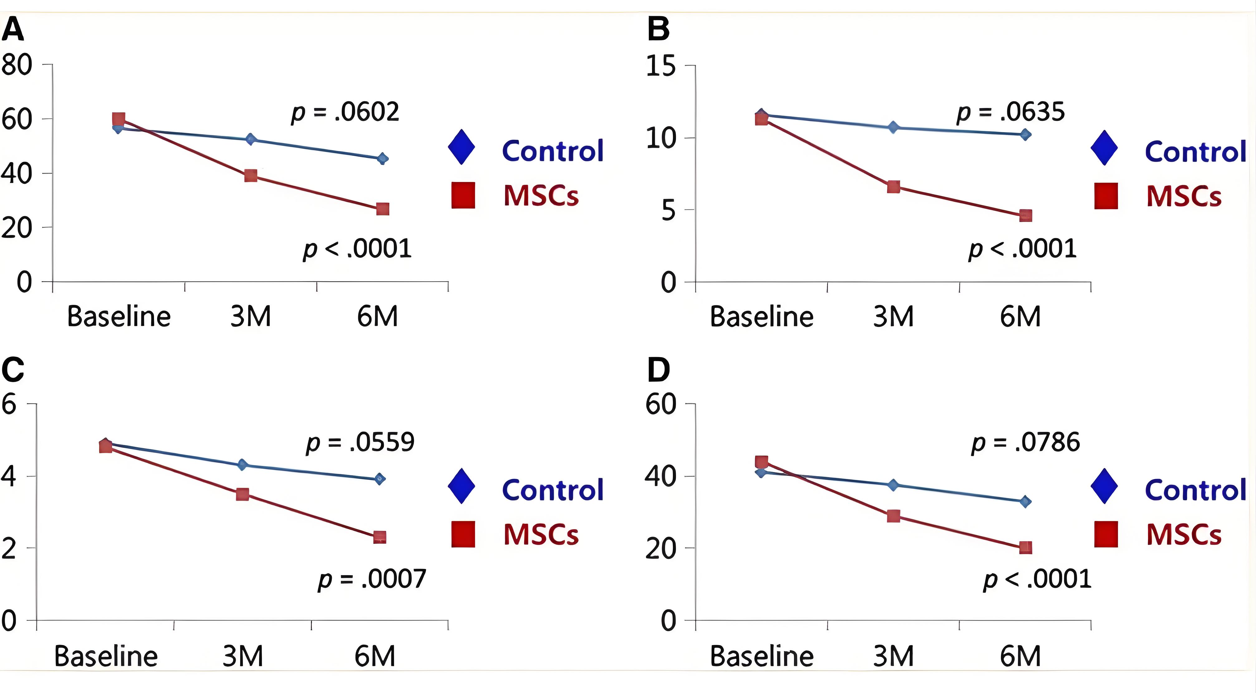 結果提示,經由單次往關節腔內注射間充質干細胞后,實驗組6個月時WOMAC評分顯著改善。對照組6個月時WOMAC評分則無顯著變化。隨訪期間兩組均未觀察到嚴重不良事件。在MRI上,實驗組在6個月時軟骨缺損沒有顯著變化,而對照組的缺損增加。該研究表明,關節內注射自體間充質干細胞為骨關節炎患者提供了疼痛緩解。