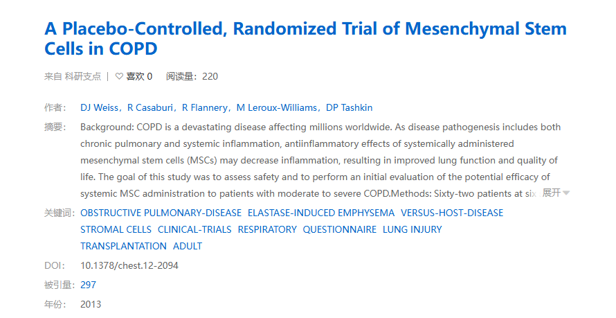 [3]Weiss DJ,Casaburi R,Flannery R,et al. A placebo-controlled,randomized trial of mesenchymal stem cells in COPD[J]. Chest,2013,143(6):1590-1598.