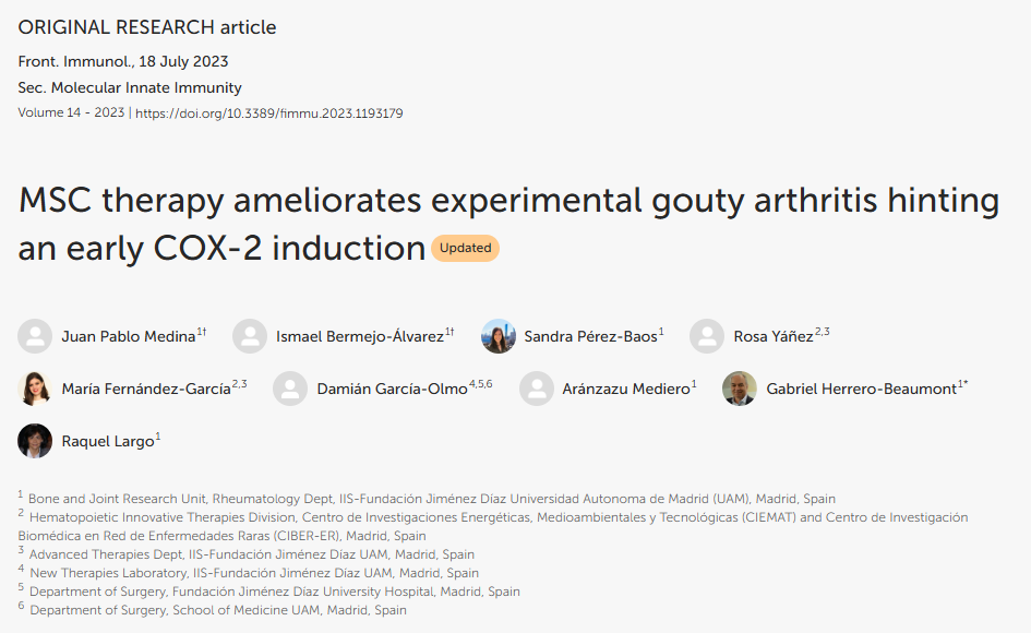 西班牙馬德里大學的臨床研究團隊于2023年7月18日在《免疫學》期刊上發表了題為“MSC therapy ameliorates experimental gouty arthritis hinting an early COX-2 induction”的臨床研究報告,表明間充質干細胞(MSC)療法可緩解痛風性關節炎。