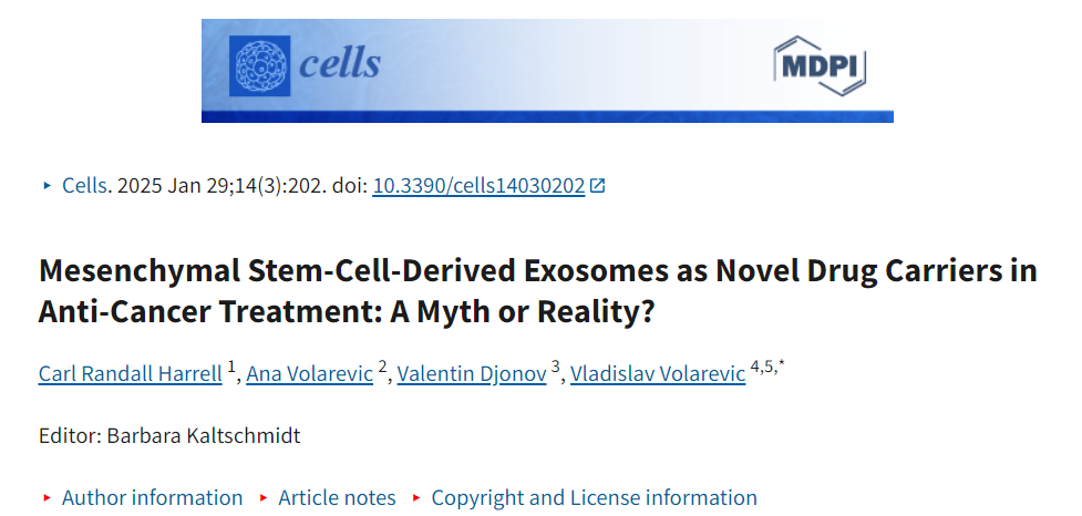 2025 年 1 月 29 日,瑞士伯爾尼大學等團隊在行業期刊Cells上發表了題為Mesenchymal Stem-Cell-Derived Exosomes as Novel Drug Carriers in Anti-Cancer Treatment: A Myth or Reality?(間充質干細胞衍生的外泌體作為抗癌治療的新型藥物載體:神話還是現實?)的綜述報告。