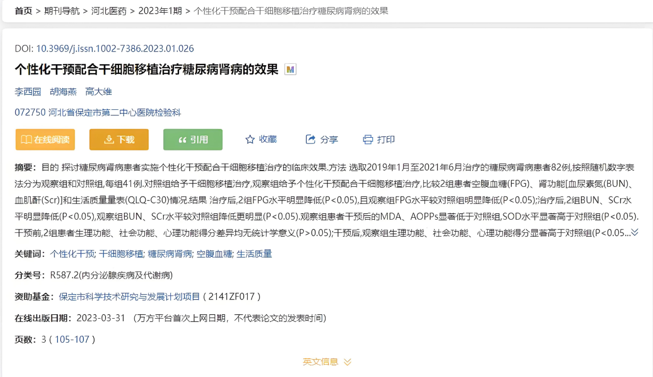 2023年3月31日,河北省保定市第二中心醫院檢驗科在《河北醫藥》期刊上發表一篇關于干細胞移植聯合傳統療法改善糖尿病腎病的文獻。