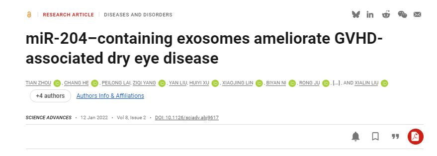 2022年1月,眼科學(xué)國家重點(diǎn)實(shí)驗(yàn)室(中山大學(xué))柳夏林教授團(tuán)隊(duì)在《Science Advance(科學(xué)進(jìn)展)》期刊上發(fā)表了一篇題為“miR-204-containing exosomes ameliorate GVHD-associated dry eye disease”(含有miR-204的外泌體可改善移植物抗宿主病相關(guān)干眼疾病)的文章,該研究首次報道了富含miR-204的外泌體可有效緩解慢性移植物抗宿主病相關(guān)性干眼癥狀和體征。