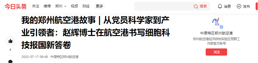 從實驗室到產業一線,從技術攻堅到生態共建,趙輝博士堅持務實求真,在真實世界中解決真實問題,在鄭州航空港譜寫新時代中國特色細胞治療產業新篇章,在高質量發展中滿足人民日益增長的美好生活需要。