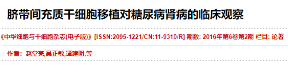 2016年,《中華細胞與干細胞雜志》報道了第二軍醫(yī)大學(xué)臨床醫(yī)學(xué)院對15名糖尿病腎病患者進行臍帶間充質(zhì)干細胞回輸?shù)呐R床試驗。