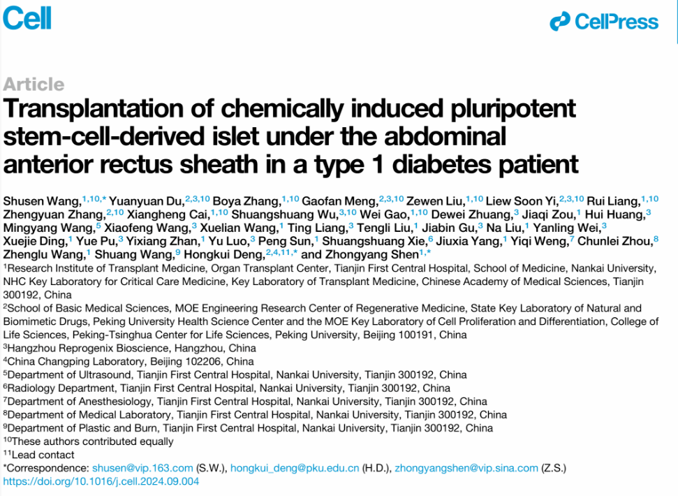 國際權威期刊《CELL》刊載了一項由中國科學家團隊完成的重大研究:首次通過基于干細胞的療法,成功實現1型糖尿病患者的臨床功能性治愈。研究論文題為《Transplantation of Chemically Induced Pluripotent Stem-Cell-Derived Islet Under Abdominal Anterior Rectus Sheath in a Type 1 Diabetes Patient》。