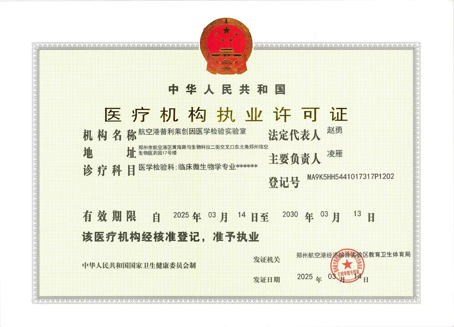 2025年3月14日,航空港普利萊創因醫學檢驗實驗室已取得《醫療機構執業許可證》,其硬件設施、技術實力及規范化管理獲得官方權威認可。此次臨床基因擴增檢驗實驗室驗收的順利通過,更進一步驗證了實驗室在分子診斷領域的技術優勢。目前,實驗室已具備開展感染性疾病分子生物學檢驗、疾病相關分子生物學及細胞遺傳學檢驗、腫瘤分子生物學檢驗、用藥指導的分子生物學檢驗四大核心檢測項目的能力,覆蓋從疾病篩查、精準診斷到個性化用藥指導的全流程服務。