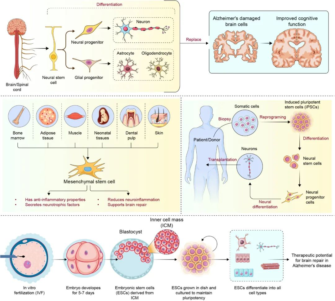 NSCs(神經(jīng)干細(xì)胞):具有直接分化為神經(jīng)元和膠質(zhì)細(xì)胞的能力。在小鼠模型中移植NSCs已顯示出改善認(rèn)知功能的潛力。