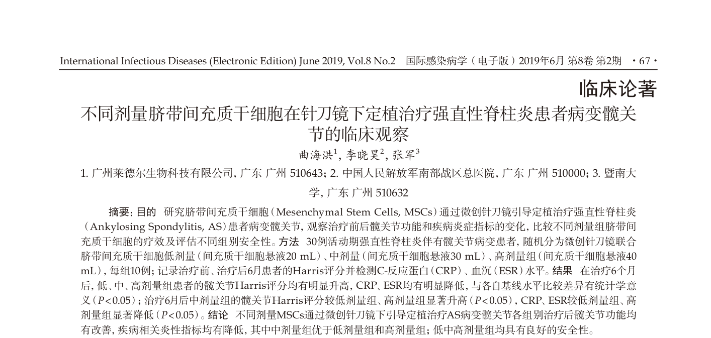 國內研究團隊在國際學術期刊上發表了題為《不同劑量臍帶間充質干細胞在關節鏡微創技術引導下植入治療強直性脊柱炎患者病變髖關節的臨床觀察》的研究報告。該研究為干細胞治療強直性脊柱炎,特別是髖關節病變,提供了新的臨床證據,結果顯示該方法安全且效果顯著。
