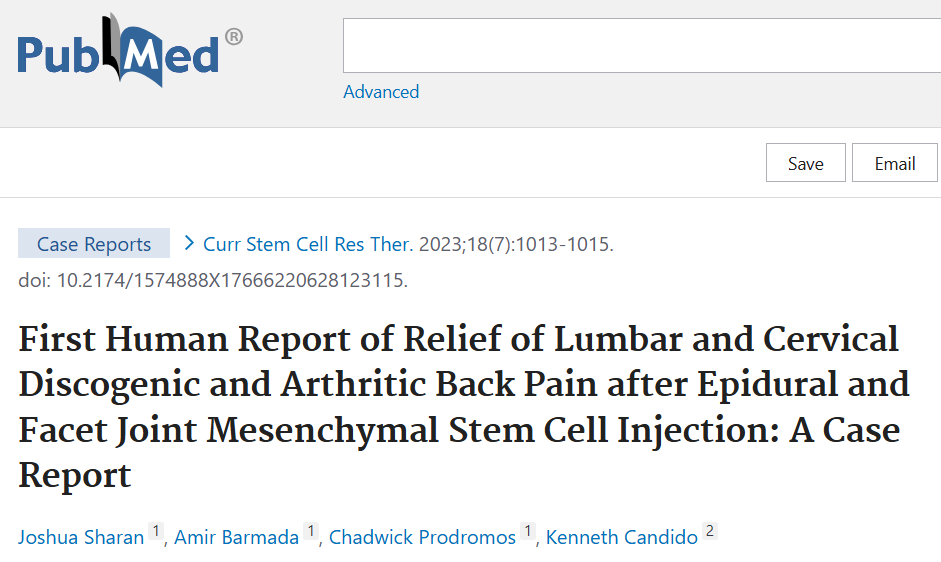2023年,期刊《Current Stem Cell Research & Therapy》發表了一篇題為《First Human Report of Relief of Lumbar and Cervical Discogenic and Arthritic Back Pain after Epidural and Facet Joint Mesenchymal Stem Cell Injection: A Case Report》的研究,為干細胞療法慢性腰背痛提供了新的臨床證據。