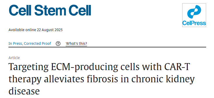 2025年8月22日,山東大學易凡教授團隊在國際權威學術期刊《Cell Stem Cell》在線發表了一項題為《Targeting ECM-Producing Cells with CAR-T Therapy Alleviates Kidney Fibrosis in Chronic Kidney Disease》的最新研究成果。該研究聚焦于腎臟纖維化的核心病理特征——細胞外基質(ECM)過度積累,在全球范圍內首次提出并成功構建了“靶向產ECM細胞的CAR-T細胞治療體系”,為慢性腎臟病(CKD)及纖維化相關疾病的治療提供了創新性策略。
