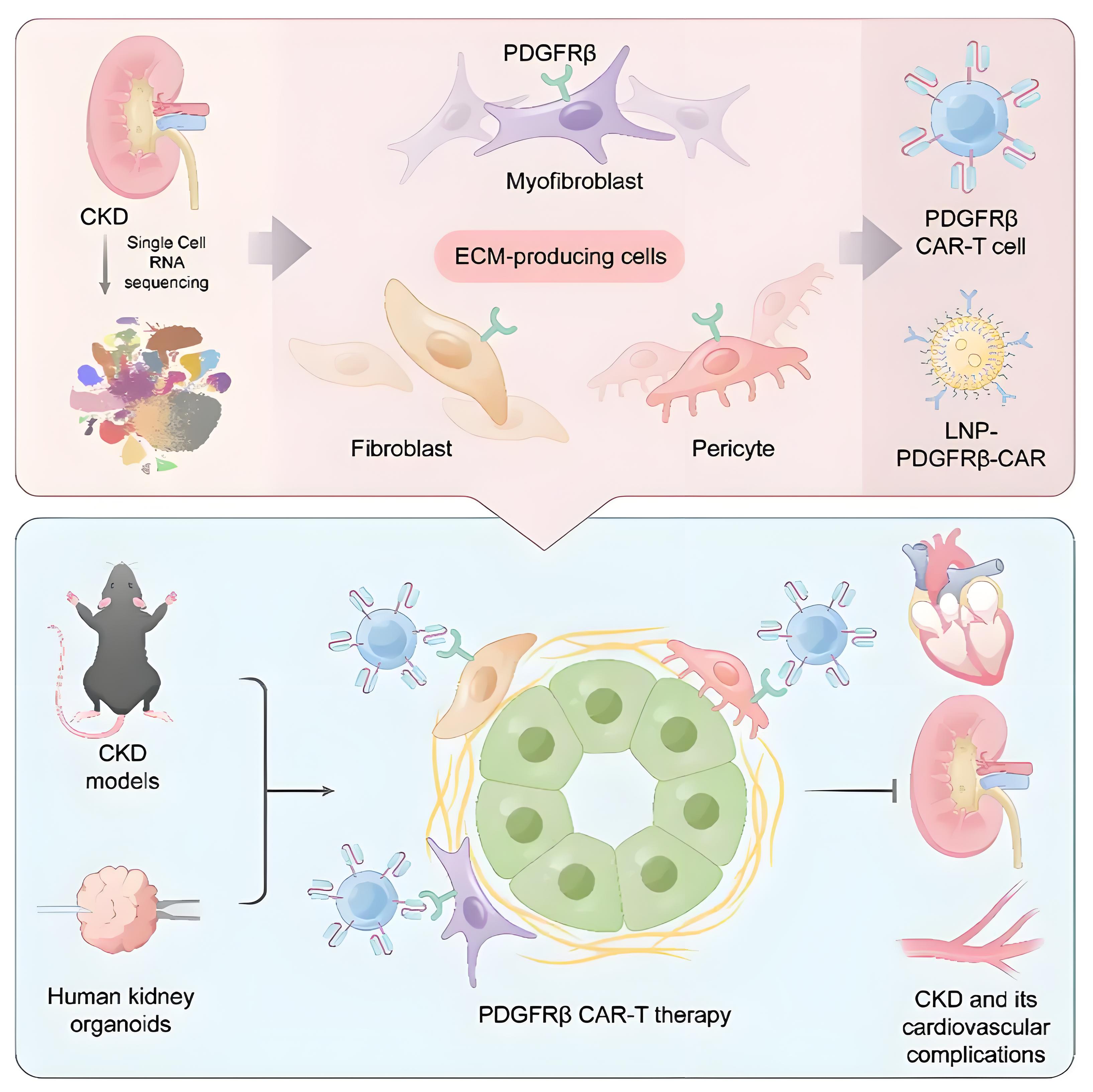 為推進臨床轉化,團隊還成功構建了靶向人PDGFRβ的CAR-T細胞,并在人多能干細胞來源的腎臟類器官CKD模型中驗證了其抗纖維化效果,進一步增強了該療法從基礎研究走向臨床應用的可行性。