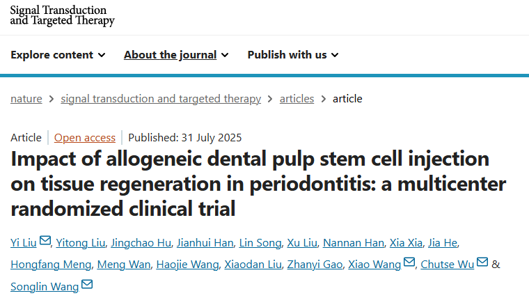 2025年7月31日,首都醫(yī)科大學王松靈院士與北京大學第三醫(yī)院口腔科王霄主任醫(yī)師等在《Nature》期刊上發(fā)表了一項多中心隨機臨床試驗成果。