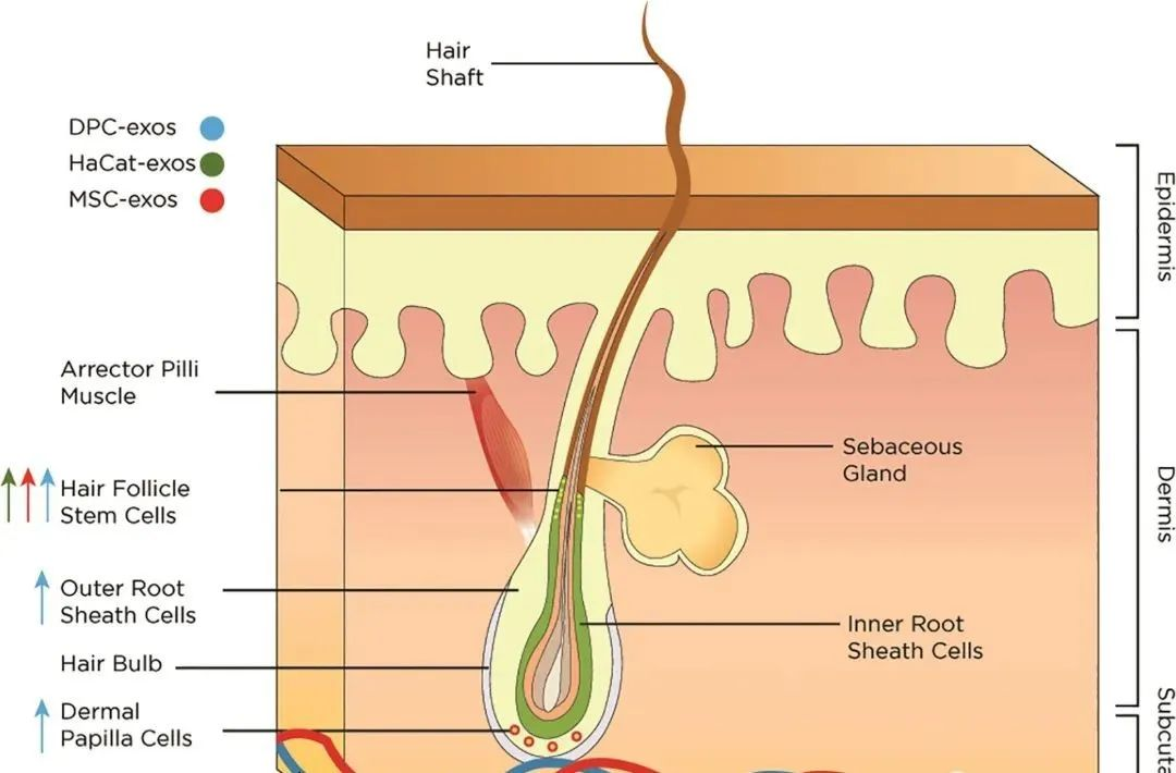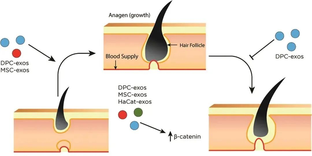研究顯示,外泌體在一定條件下有助于促進毛囊干細胞、外根鞘細胞和真皮乳頭細胞的增殖與分化。真皮來源的外泌體可調節Wnt/β-連環蛋白信號通路,該通路被認為是調控毛發再生與形態發生的重要機制之一。
