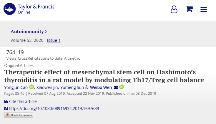 一項發(fā)表于《Autoimmunity》的研究《Therapeutic effect of mesenchymal stem cell on Hashimoto's thyroiditis in a rat model by modulating Th17/Treg cell balance(干細胞通過調(diào)節(jié)Th17/Treg細胞平衡改善大鼠橋本甲狀腺炎的治療效果)》顯示,研究人員利用雌性SD大鼠構(gòu)建HT模型,評估MSCs對Th17/Treg平衡的調(diào)節(jié)作用: